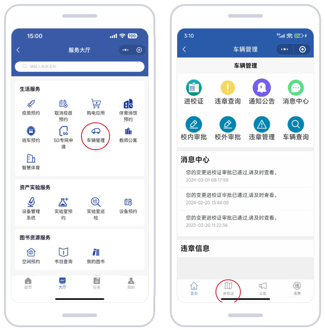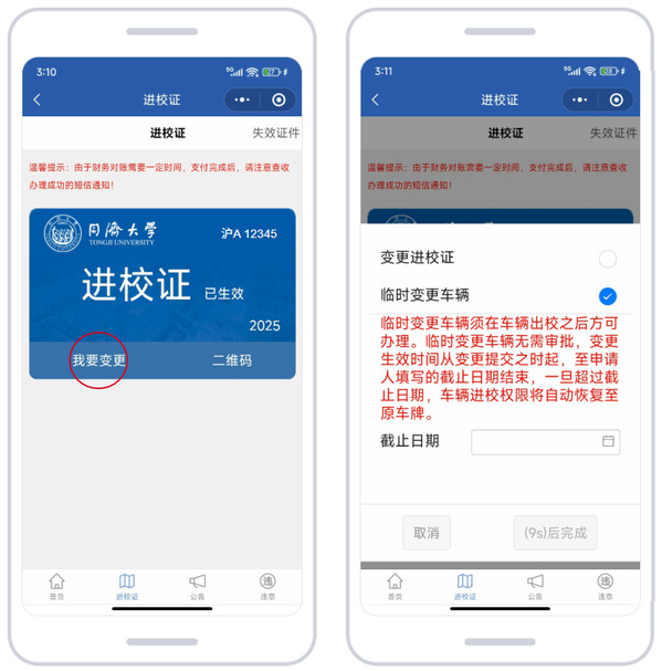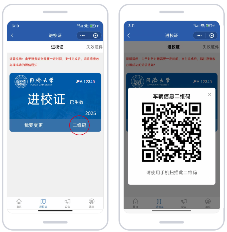 提示:临时变更车辆不提供实体进校证,移动端进校证增加了二维码,如遇门卫核验,请在移动端车辆管理界面打开二维码配合查验。